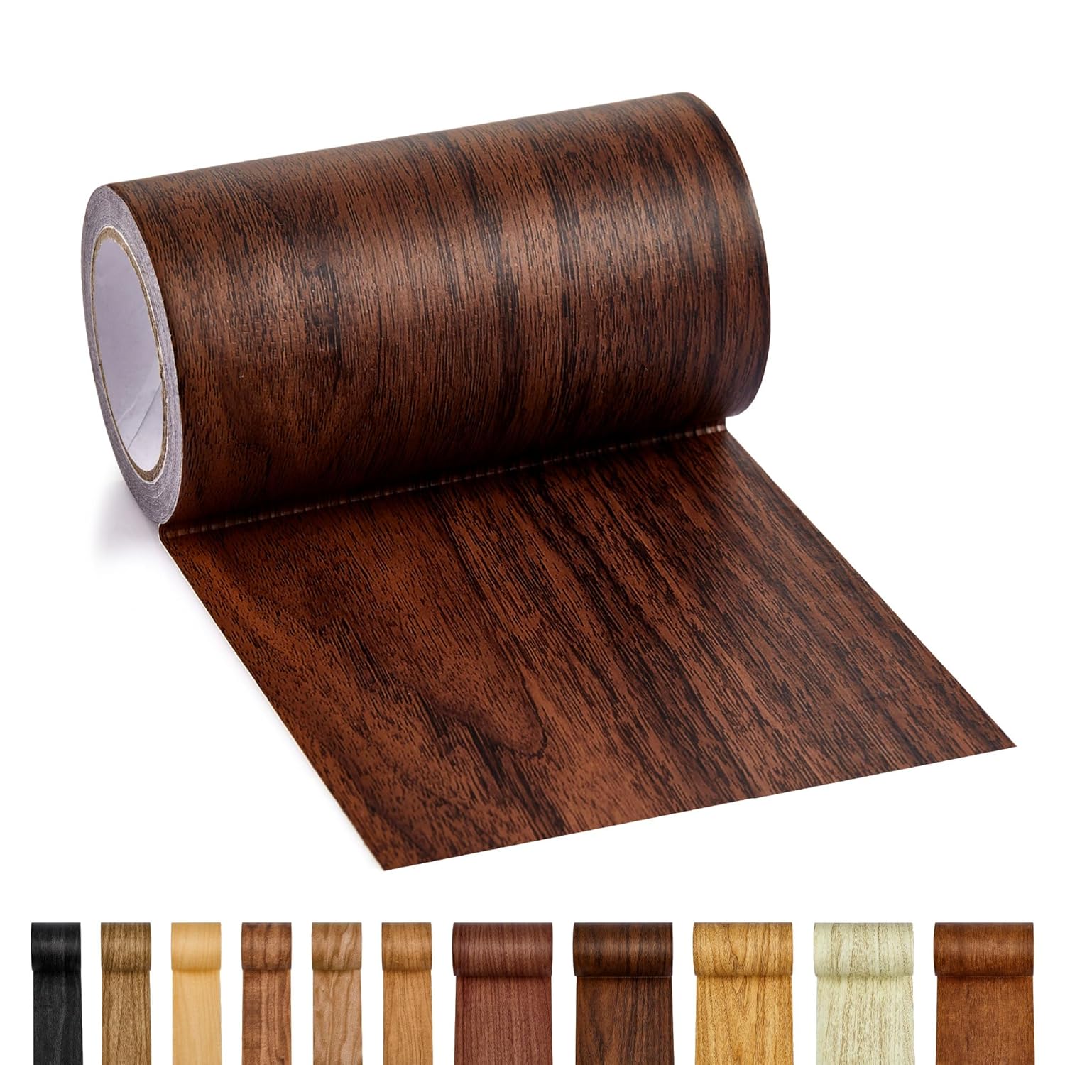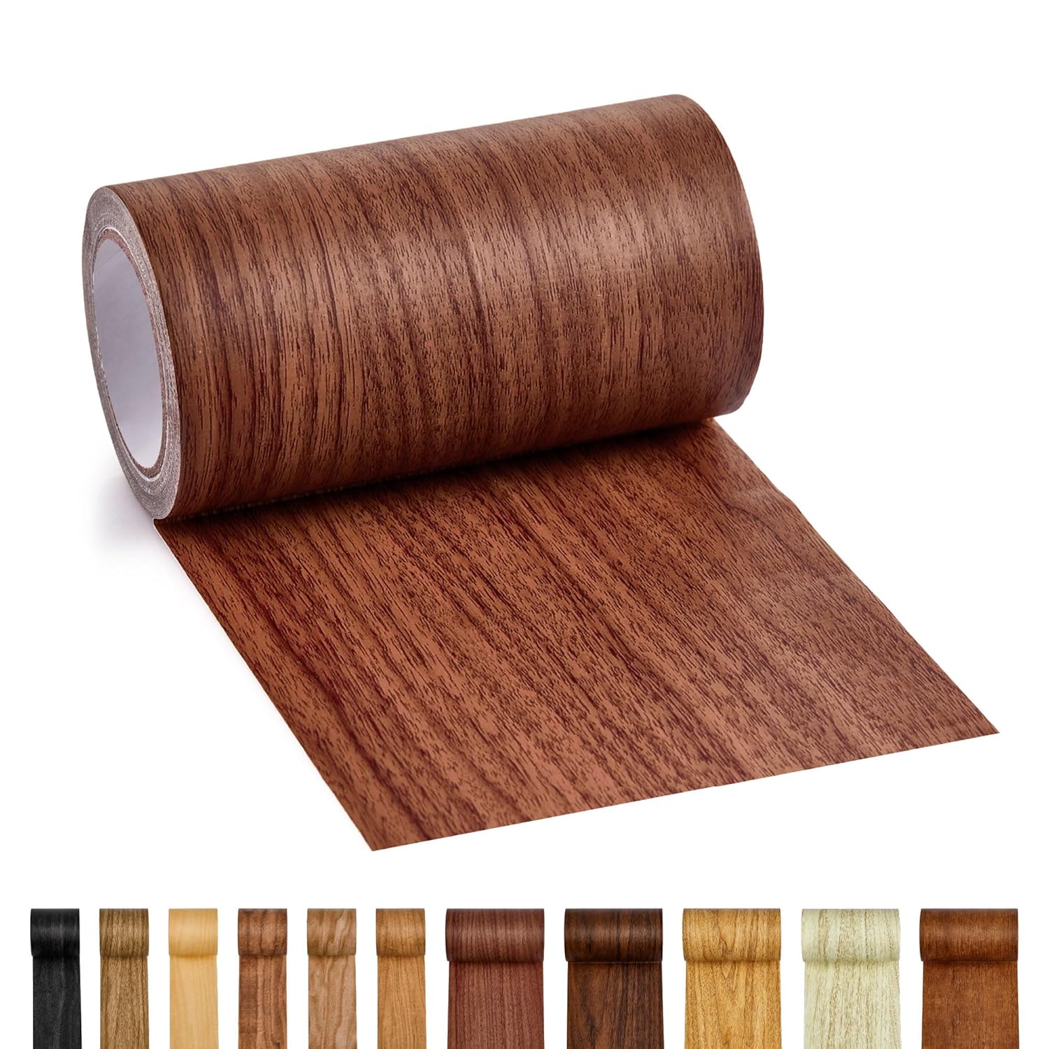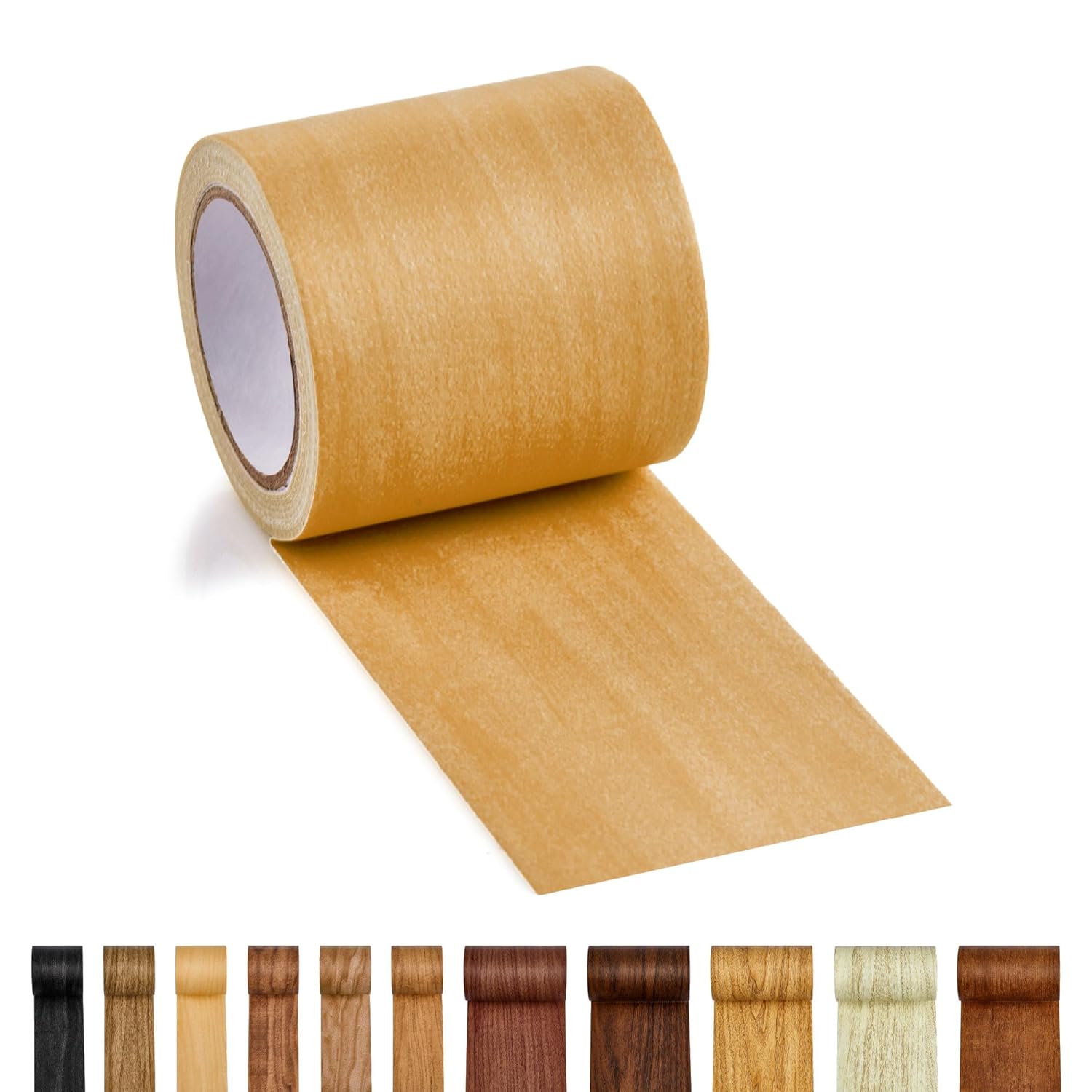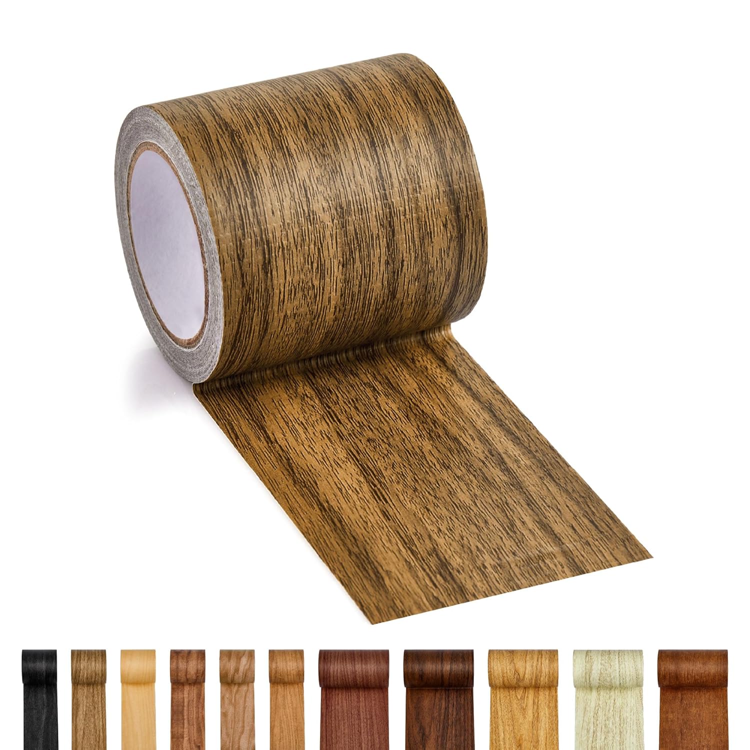 Self-adhesive wood grain tape for quick furniture and surface repairs. Available in 11 colors.