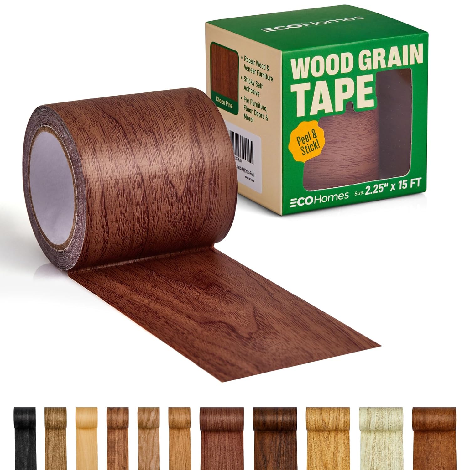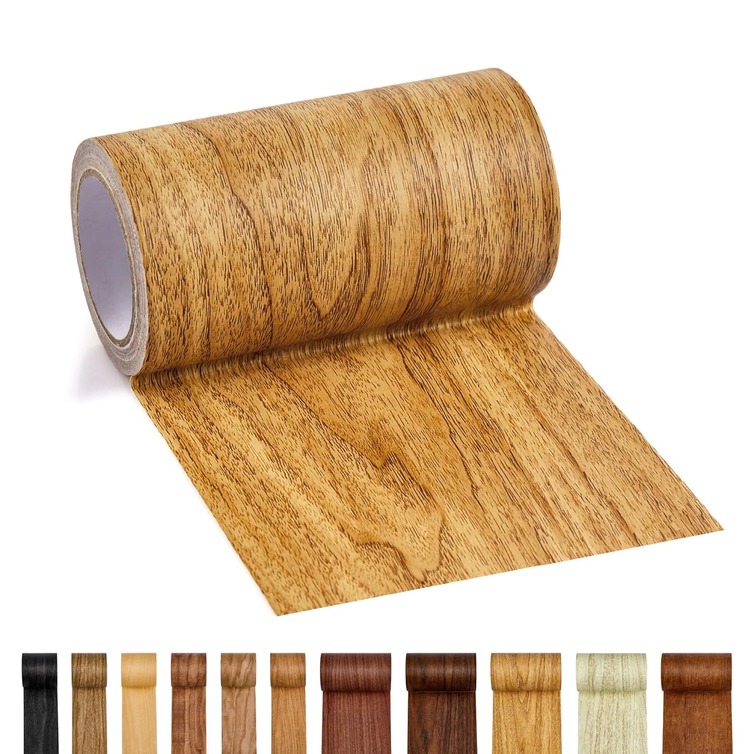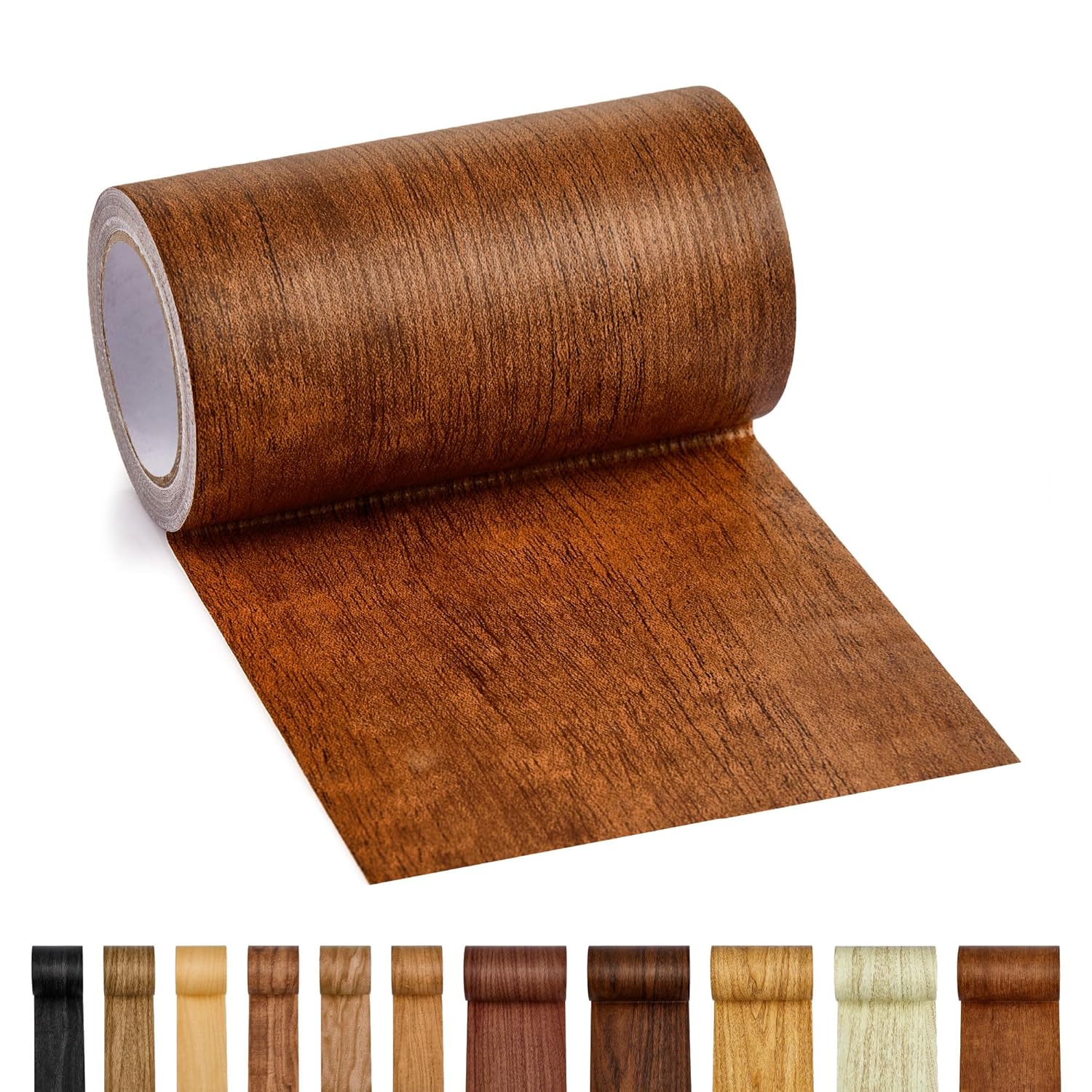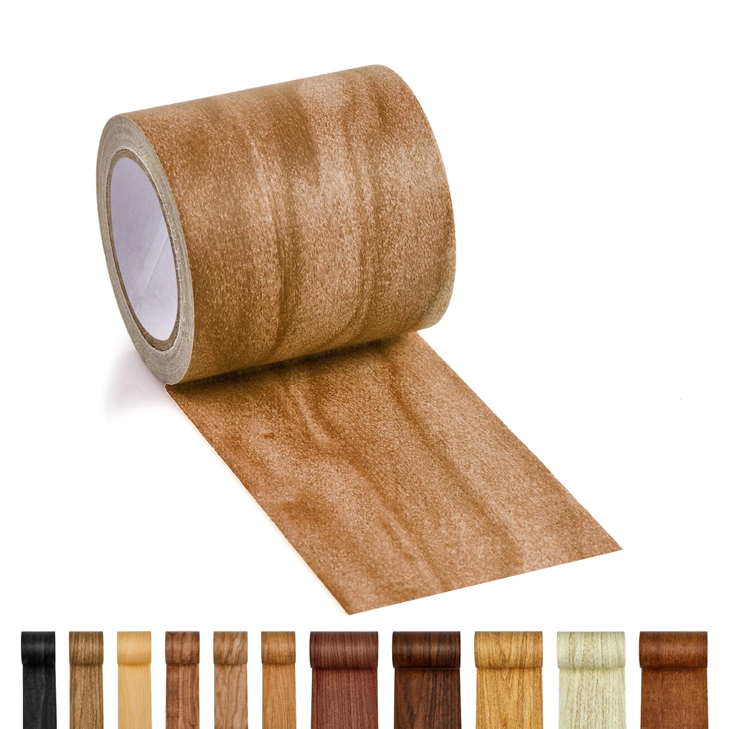 Self-adhesive wood grain tape for quick furniture and surface repairs. Available in 11 colors.