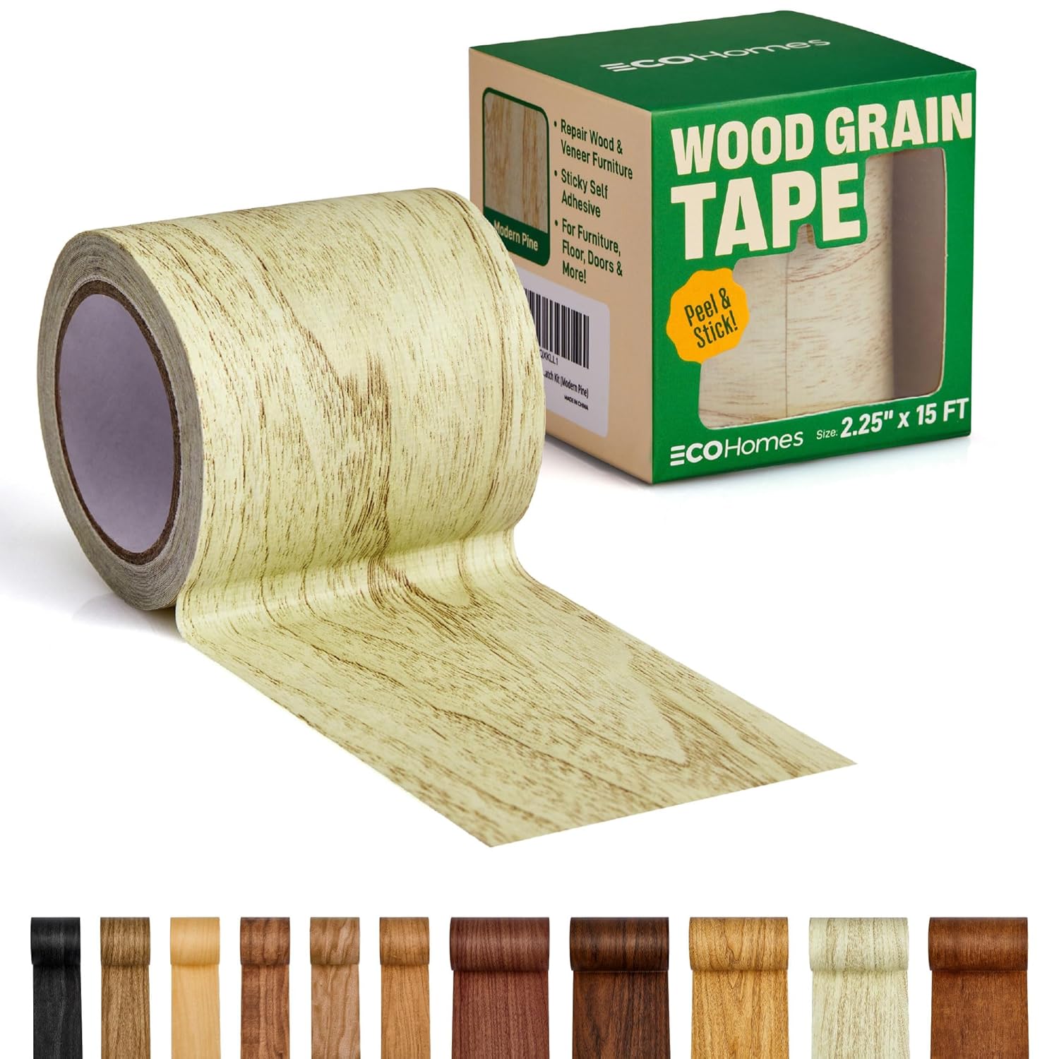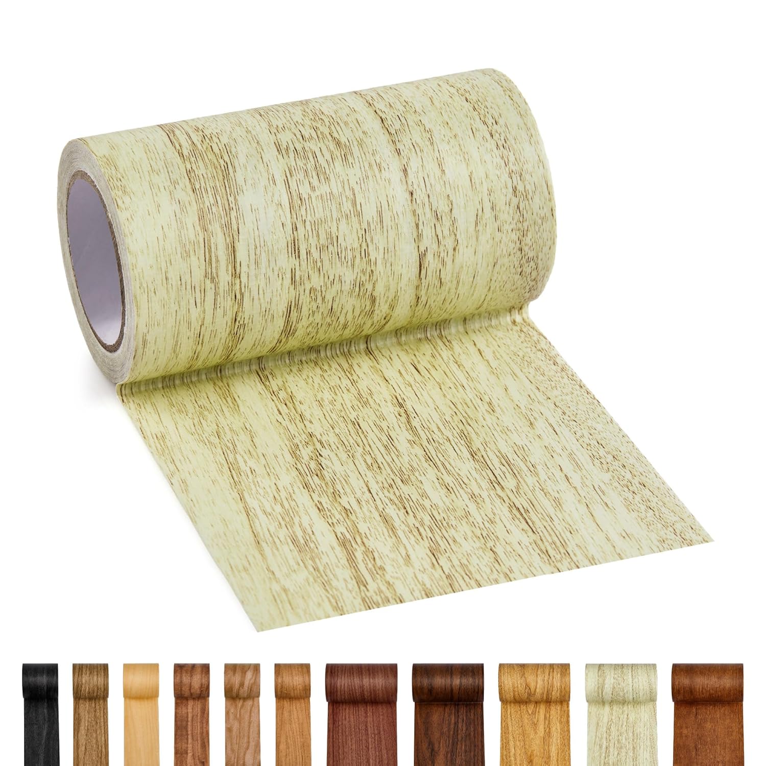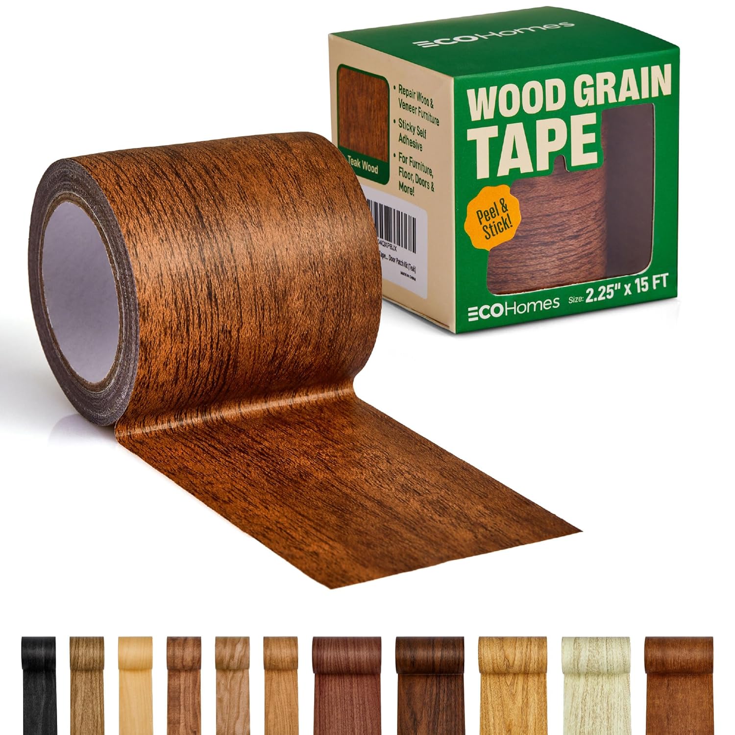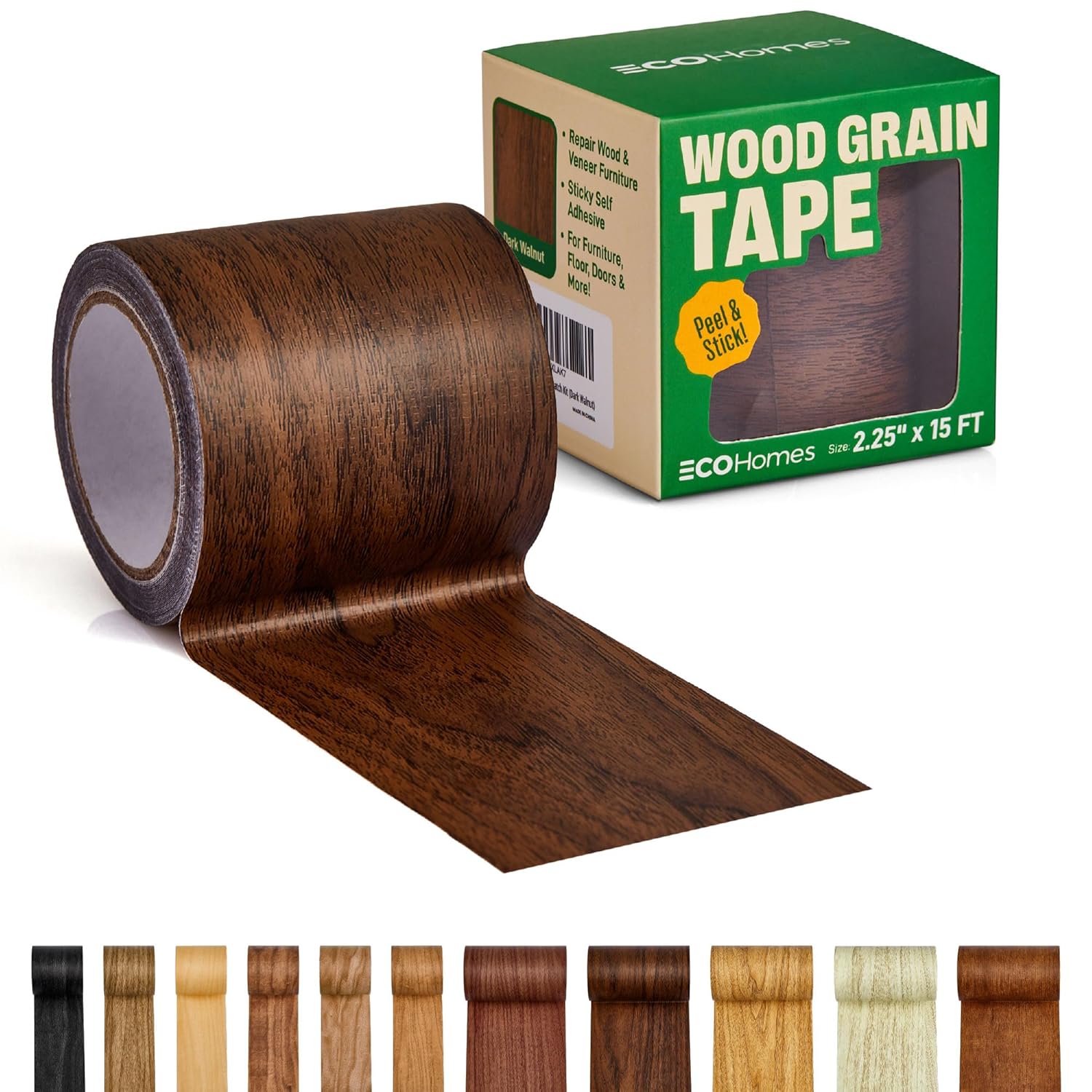 Self-adhesive wood grain tape for quick furniture and surface repairs. Available in 11 colors.
