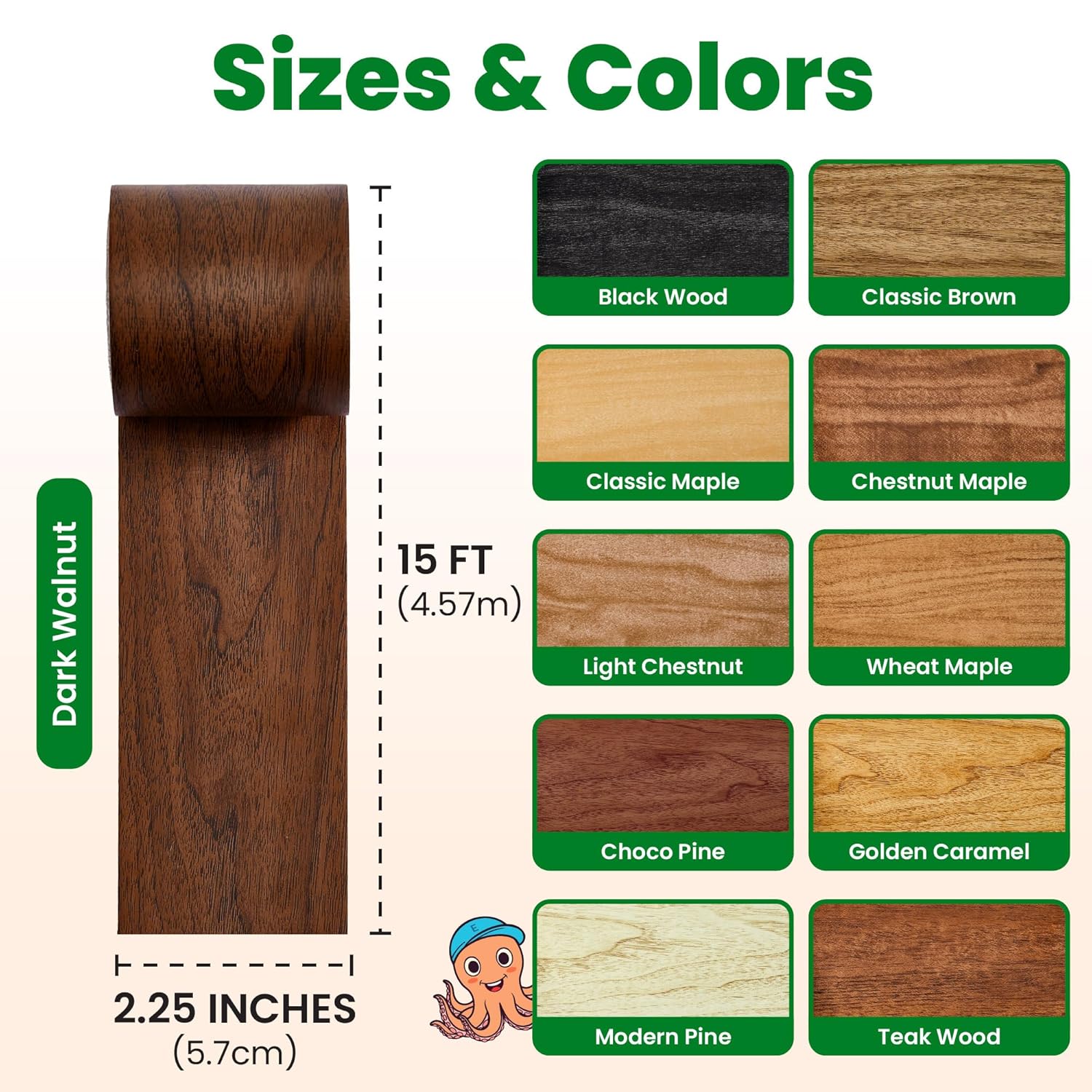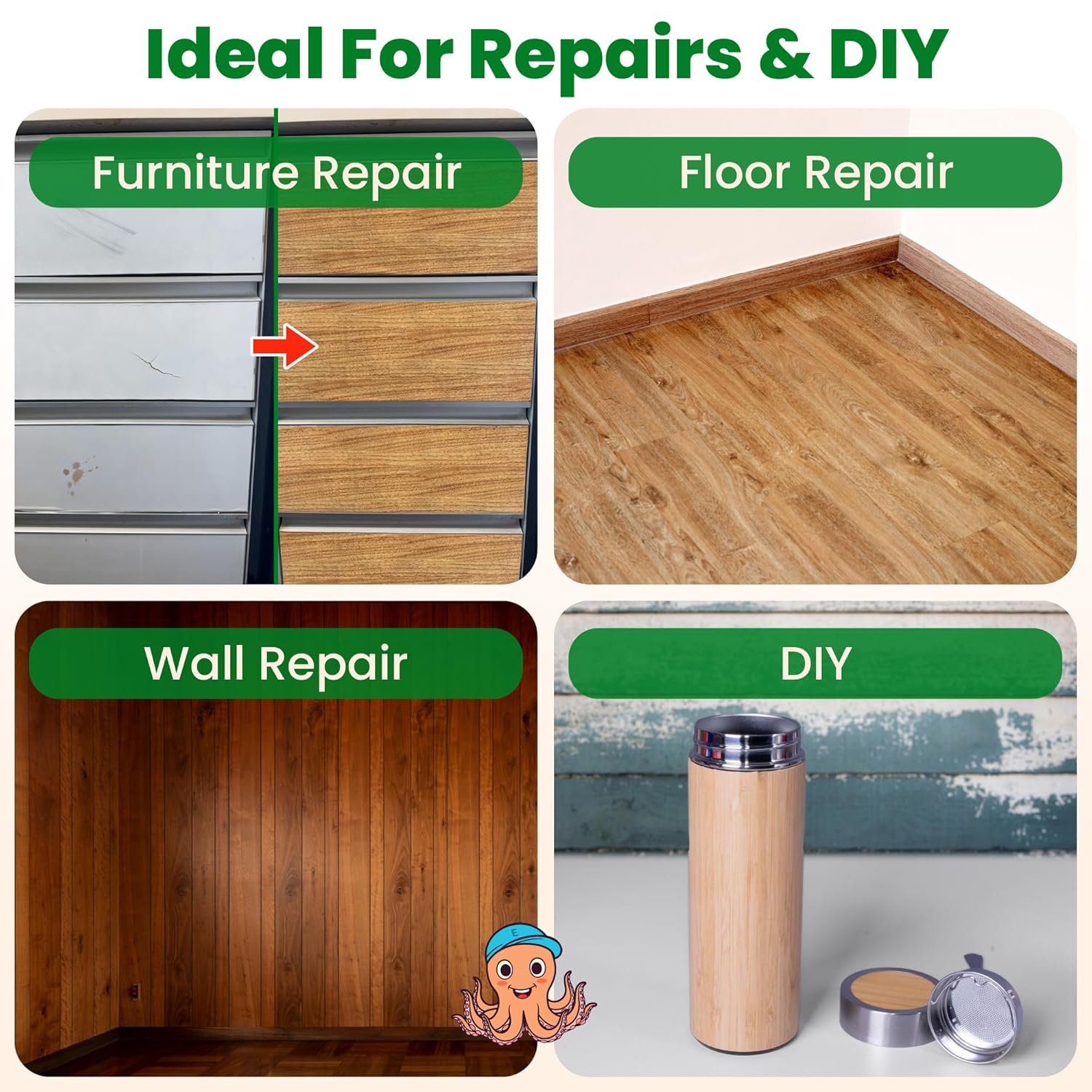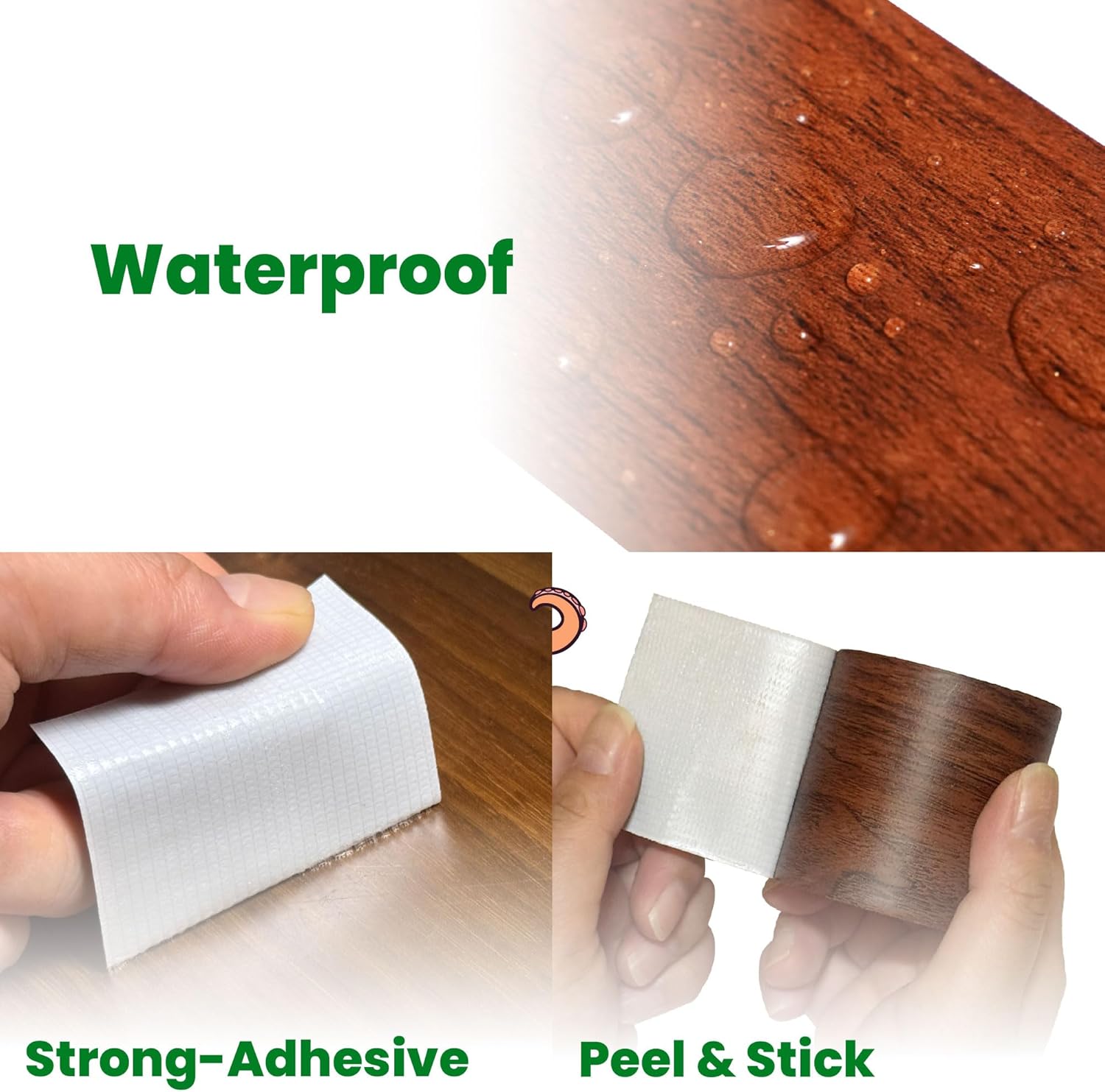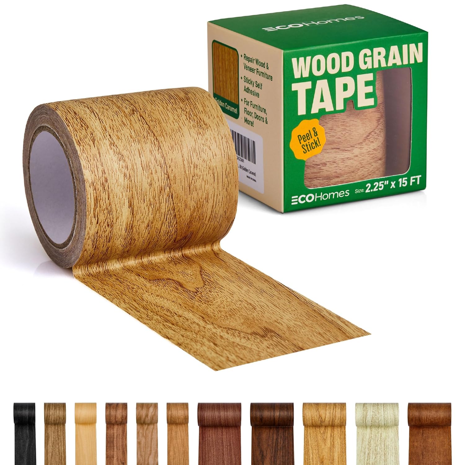 Self-adhesive wood grain tape for quick furniture and surface repairs. Available in 11 colors.