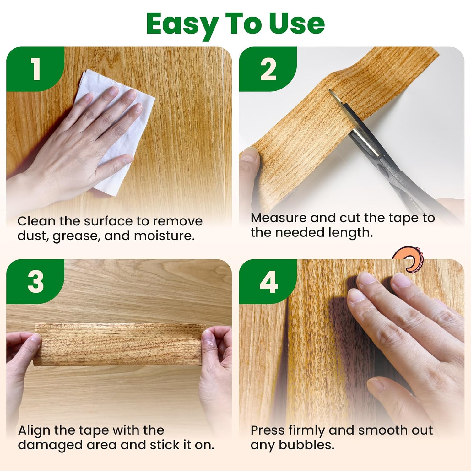 ECOHomes Wood Grain Repair Tape is the perfect solution for covering scratches, dents, and imperfections on wooden furniture, floors, and cabinets. This self-adhesive wood-colored tape blends seamlessly with your existing wood surfaces, providing an instant cosmetic repair without the need for sanding, staining, or refinishing.
