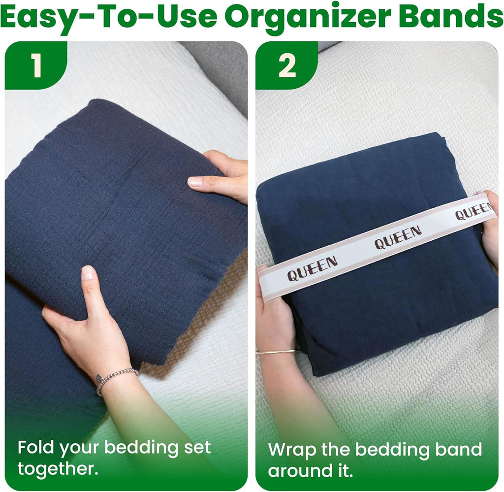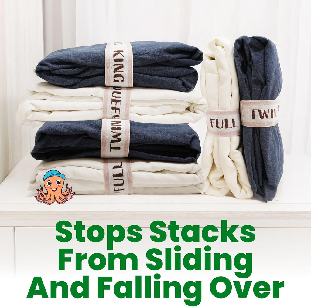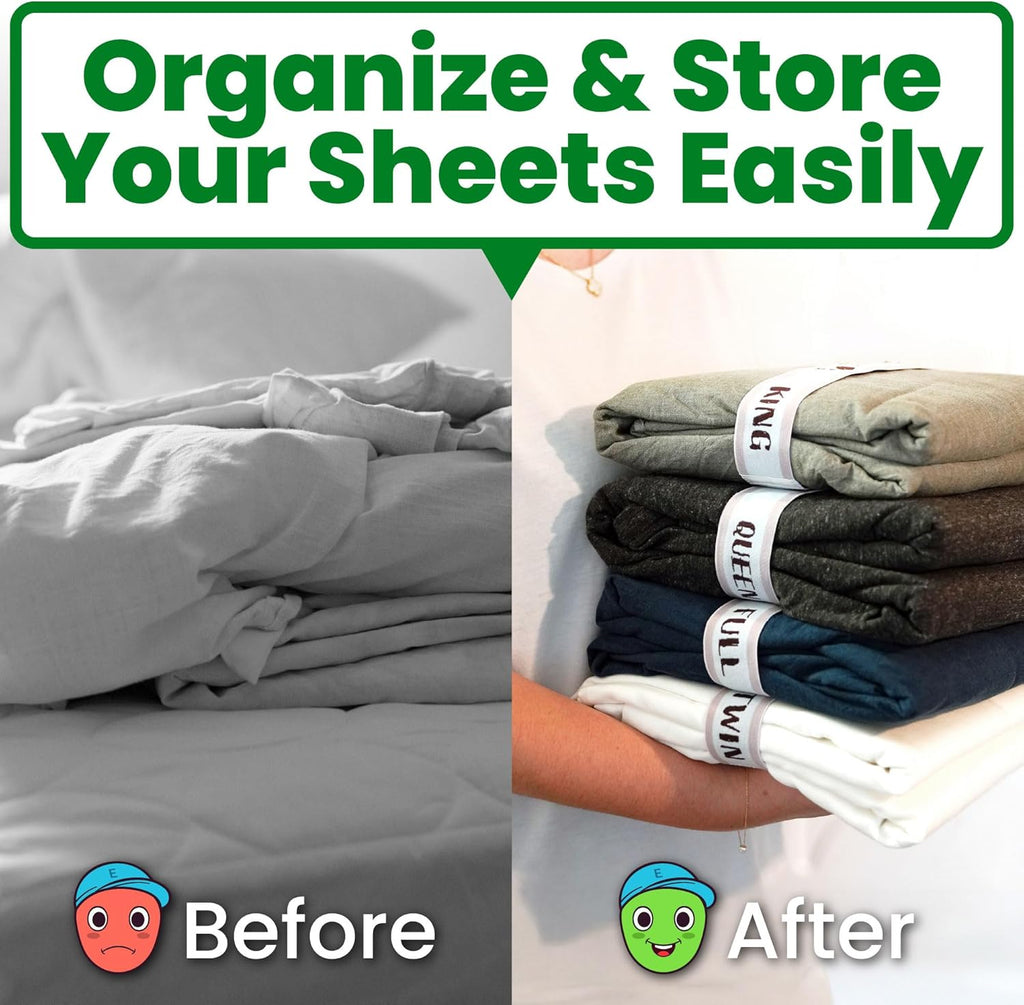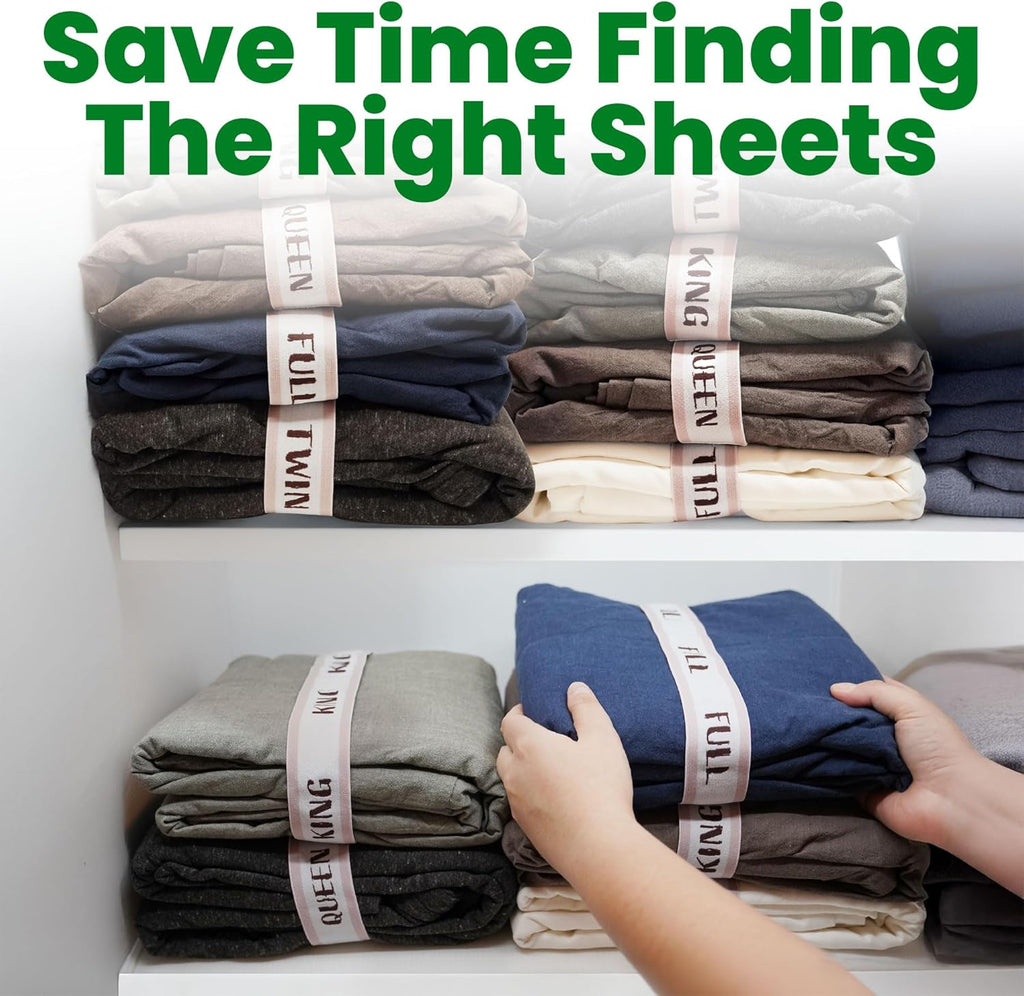 Fold your bed sheets, pillow cases, protectors, mattress pads, duvets and linens as usual. Simply wrap around these easily identifiable sheet label bed band straps. Labeling and identifying your sheet sets have never been easier!